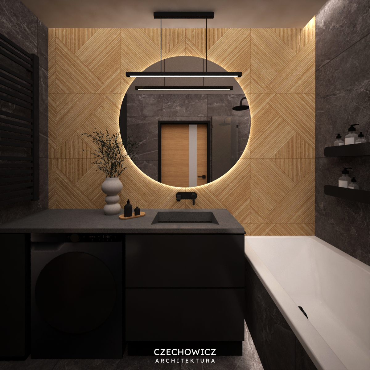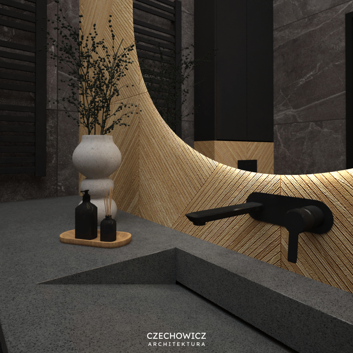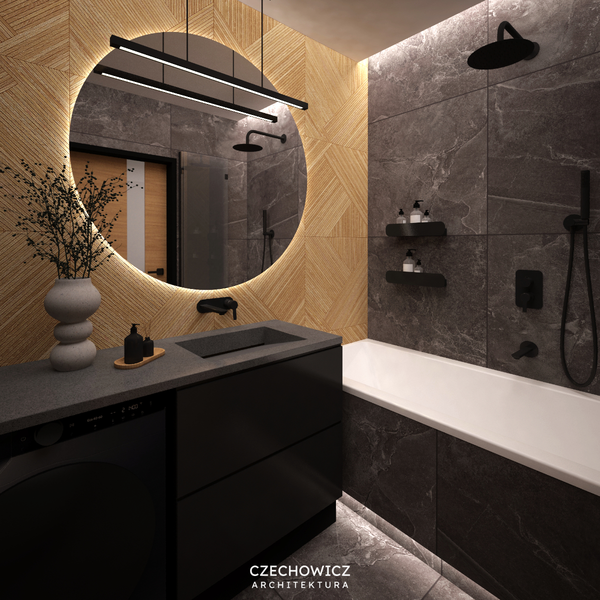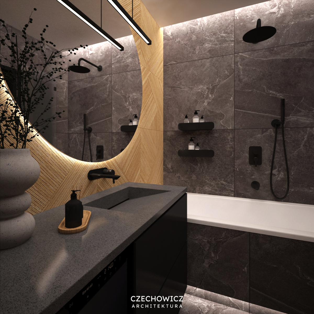 Projekt łazienki w ciemnej kolorystyce w stylu tzw. soft loft przykuwa uwagę swoją nowoczesnością i surowością. To łazienka, która powstała dla singla. Miała być ciemna, minimalistyczna i z charakterem. W projekcie zastosowałam ciemny gres ze wzorem kamienia, płytki o ciekawej fakturze w naturalnym kolorze drewna oraz czarną armaturę. Klimat tej łazienki stworzony jest przez nastrojowe oświetlenie. Zapraszam do obejrzenia projektu.